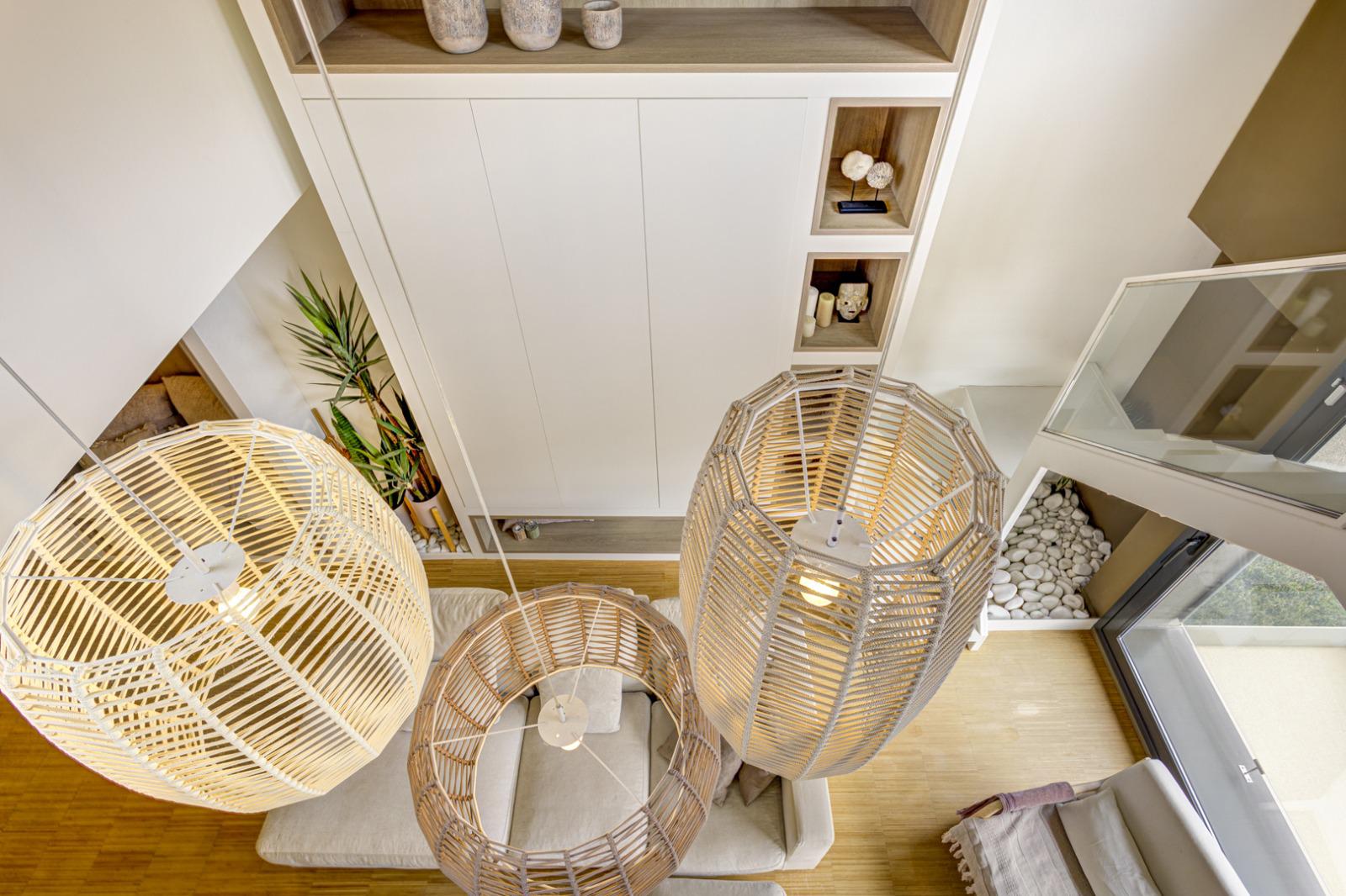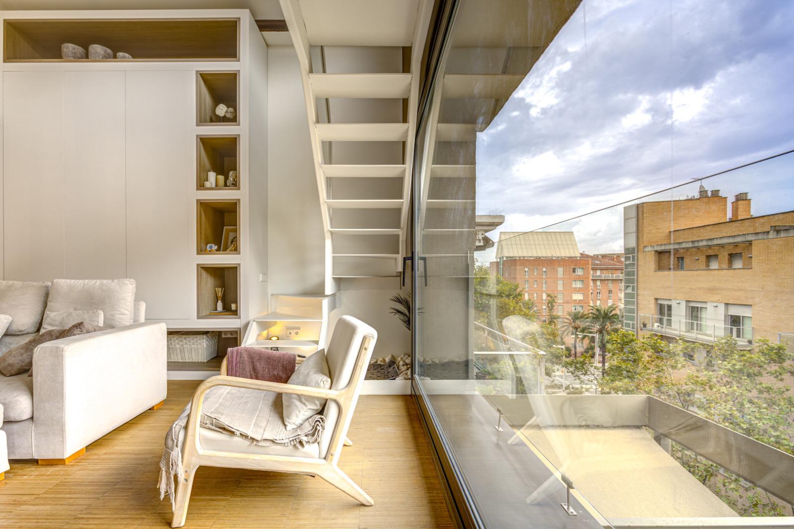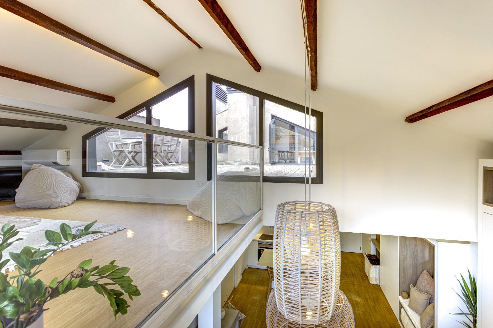 Una escalera ligera y elegante conduce a la planta superior, donde un espacio abuhardillado de 27 m² se adapta con versatilidad a diferentes usos: puede ser una zona de lectura, un despacho, un rincón de juego o incluso un dormitorio adicional. Desde aquí se accede a la terraza privada, un oasis de intimidad con vistas al Tibidabo, perfecto para relajarse al sol o disfrutar de veladas al aire libre. Junto a ella, un espacio independiente permite crear un despacho o habitación auxiliar, bañado igualmente por la luz natural.