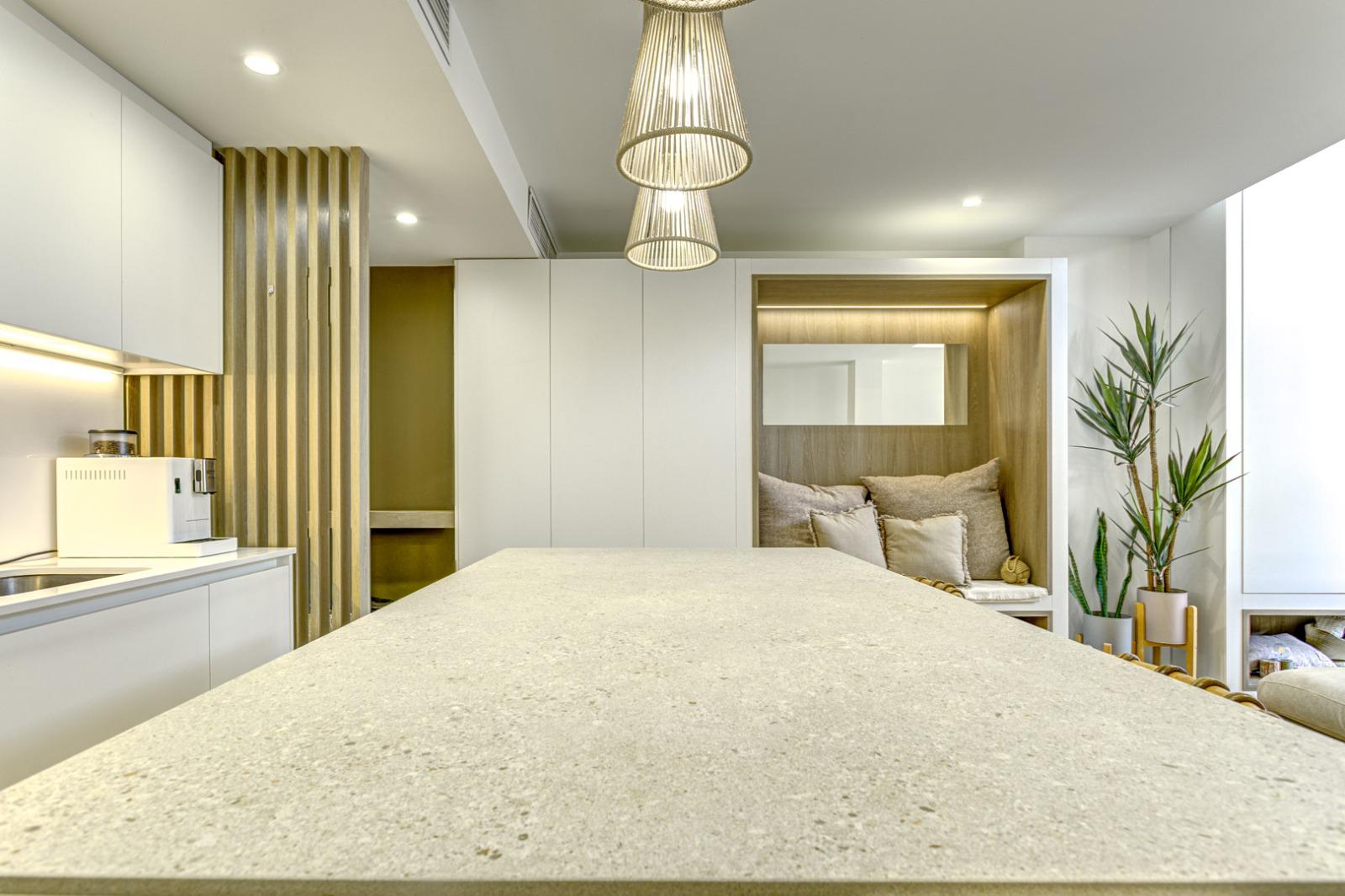 Al entrar, un amplio salón-comedor recibe con una atmósfera cálida y acogedora. Los ventanales de gran formato ofrecen vistas despejadas y una luminosidad envolvente, mientras que el mobiliario a medida y los armarios de doble altura añaden elegancia y funcionalidad. La cocina abierta, totalmente equipada, gira en torno a una isla central de líneas modernas, ideal para compartir momentos en compañía. En esta misma planta, dos dormitorios con baño en suite y armarios empotrados completan el nivel principal, ofreciendo confort y privacidad.